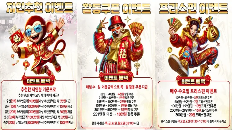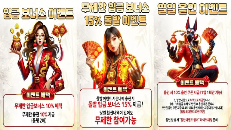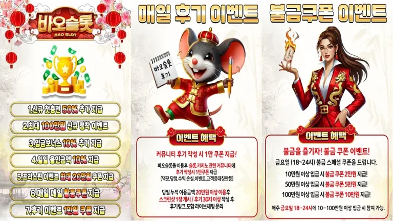 바오슬롯 이벤트 총정리 지금 바로 참여하고 다양한 혜택을 누리세요! 바오슬롯에서는 신규회원부터 기존회원까지 모두가 만족할 수 있는 다양한 프로모션과 이벤트를 진행 중입니다. 아래는 모든 이벤트를 한눈에 정리한 가이드입니다. 다양한 보너스를 받고 싶다면 지금 바로 확인하세요! 이벤트 참여 팁 & 주의사항 모든 이벤트는 라이브채팅 신청 필수중복 참여 불가, 악용 시 혜택 회수 및 계정 제재이벤트 세부 조건 및 보너스 출금 규정 반드시 확인 신규회원 가입머니 – 5만원 쿠폰 지급!신규가입 첫충전 보너스 – 최대 50% 지급!신규정착을 위한 혜택 – 가입 이후 누적금액! 무제한 입금 보너스 – 입금 시마다 10%!무제한 돌발 보너스 – 돌발시간에 15%!무제한 올인 이벤트 – 올인할 때마다 보너스! 지인추천 혜택 – 추천인과 지인 모두에게 혜택!활동쿠폰 혜택 – 플레이를 하는만큼 돌려받기!프리스핀 이벤트 – 입금만 해도 쿠폰 지급! 후기 이벤트 – 후기 작성만 해도 쿠폰 지급!불금 스페셜 쿠폰 – 매주 금요일 단 하루! 지금 바로 바오슬롯에 가입하고 다양한 이벤트 혜택을 누리세요! 회원가입만 해도 풍성한 보너스를 받을 수 있는 바오슬롯 이벤트 혜택, 지금 바로 참여하고 특별한 슬롯 경험을 누려보세요! 궁금한사항 문의는 언제든 [라이브채팅]으로 가능합니다. 바오슬롯 (BAOSLOT) 메인페이지로